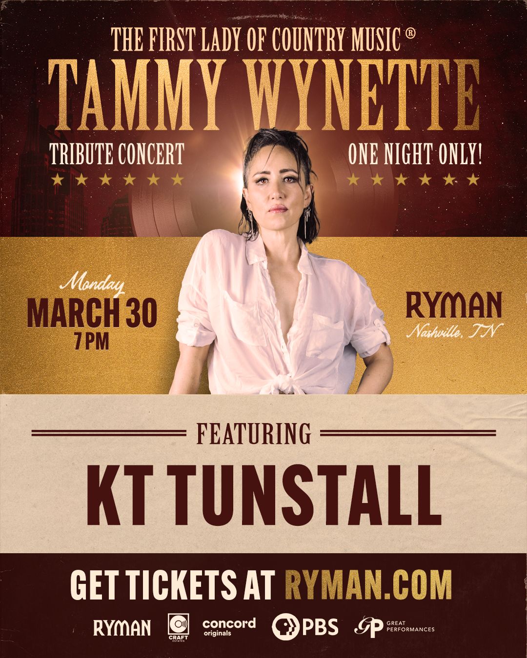 On Monday, March 30th, KT TUNSTALL will be performing at the Tammy Wynette Tribute Concert at the Ryman Auditorium in Nashville. Other artists on the bill include Wynonna, Ann Wilson (Heart), Gretchen Wilson, Lucinda Williams and Patty Griffin. The Tribute is being filmed for an upcoming PBS Great Performances.